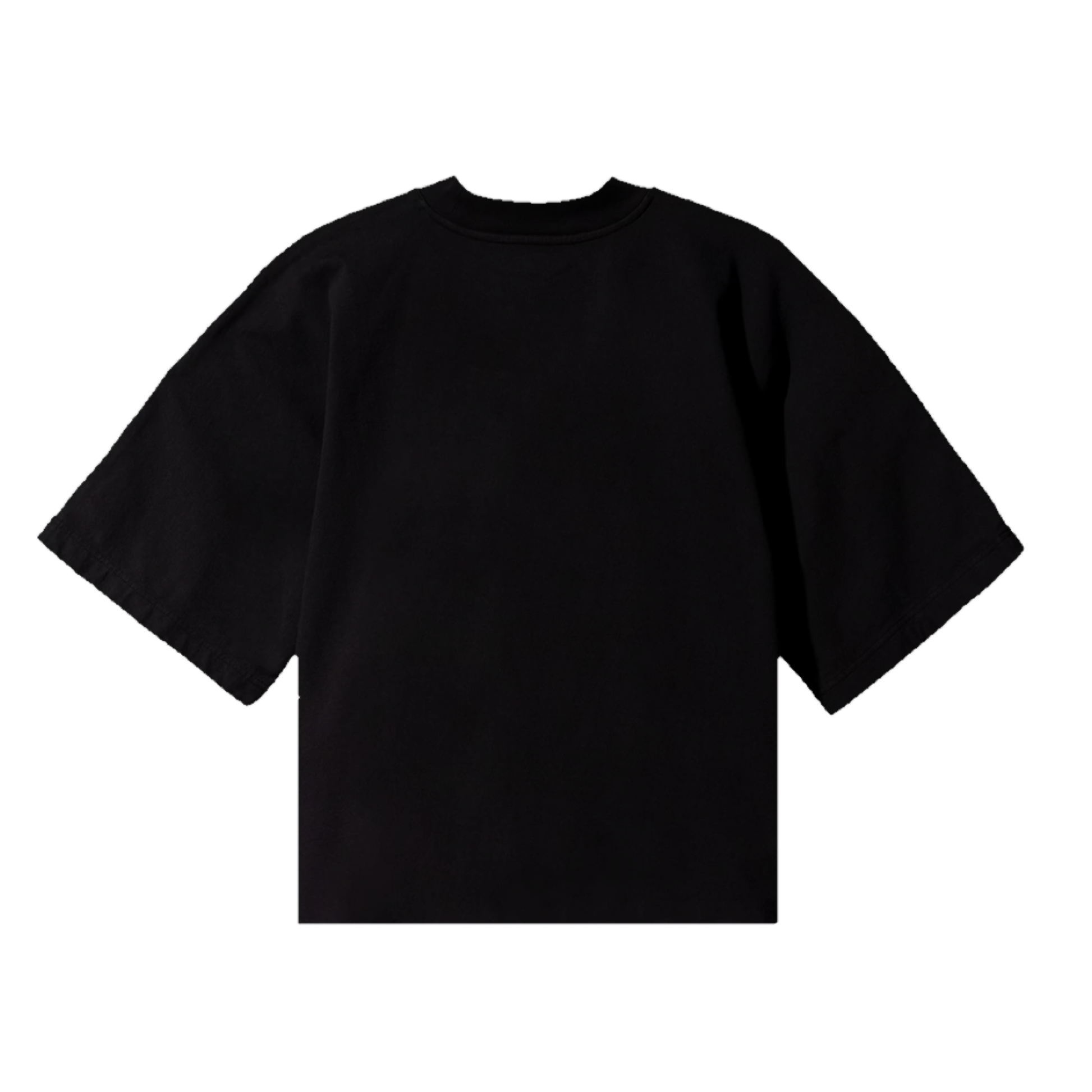シームレスのブラックTシャツ。胸元には同系色のロゴ。オーバーサイズのシルエット。ガーメントウォッシュ加工。アメリカ製。